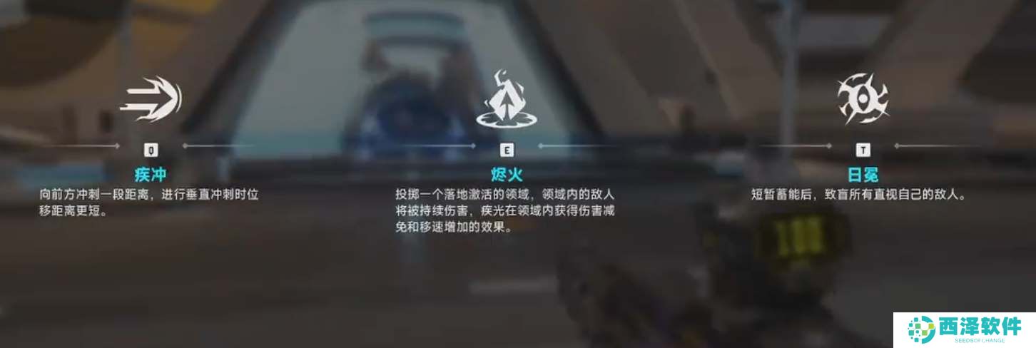 2技能 烬火:投挪一个落地激活的领域,领域内的敌人将被持续伤害,疾光在领域内获得伤害减免和移速增加的效果。
