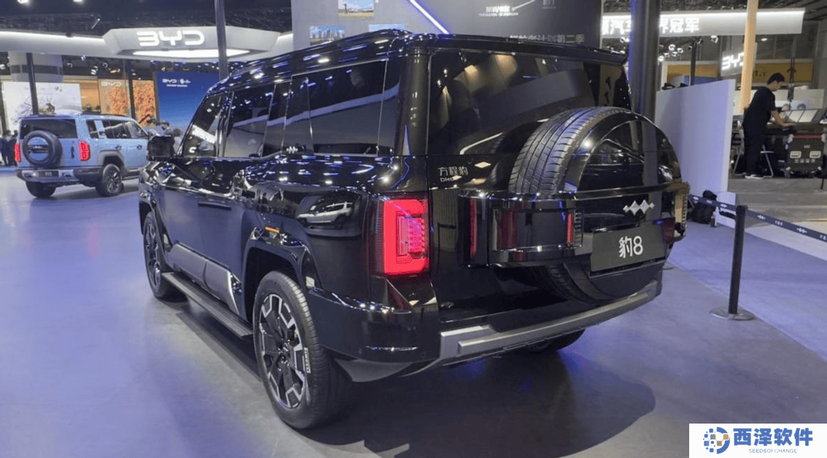 车身设计方面,豹8展现出独特的未来感与越野气息。车尾部分,环绕式备胎罩设计独具匠心,品牌标识在夜晚也能点亮,彰显个性。全尺寸备胎与侧开尾门设计,不仅实用,更添越野风范。尾灯与日间行车灯相呼应,形成独特的视觉效果。隐藏式门把手、电动侧踏等配置,以及可选装的2.5吨拖挂资质,进一步提升了车辆的实用性和便利性。